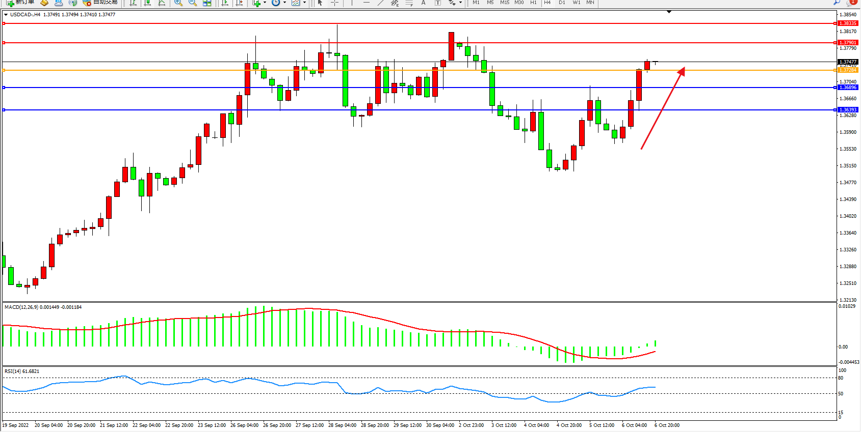 美元加元USDCAD——4小时K线图显示: