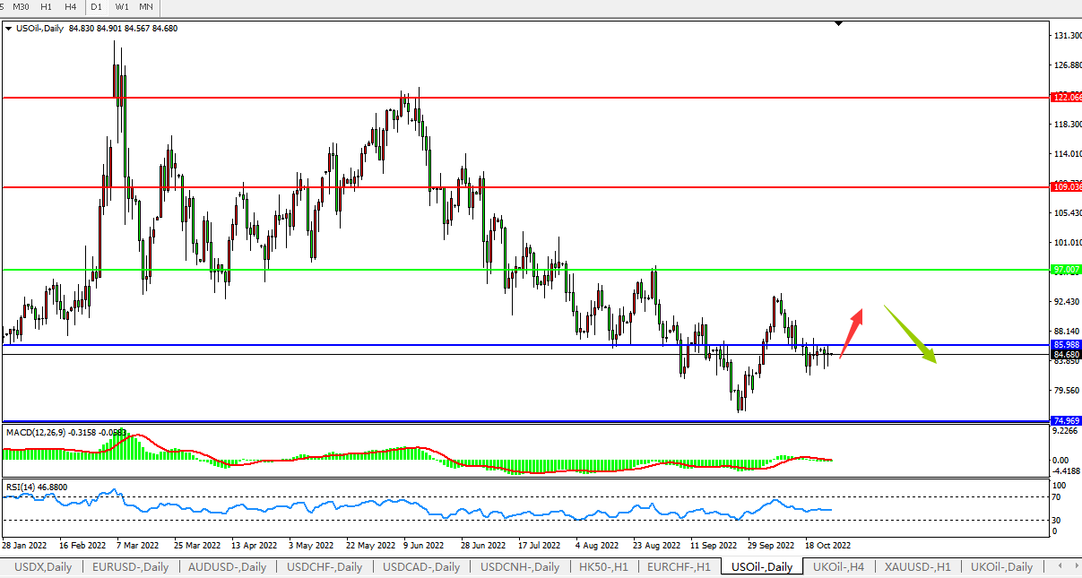 日线图看:油价低位弱势整理, MACD量能柱0轴上方开始缩量,RSI指标走势平缓,短期油价延续整理,后续反弹上攻概率较大。