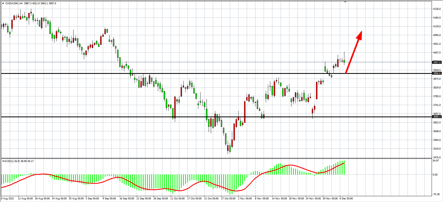 4小时图看,沪深3000在3900之上持续走强,一度触及4000点之上,MACD于零轴之上持续走高,显示行情有进一步扩大涨幅需求,当前支撑继续关注3900一线,在该位之上继续以看涨为主,上方目标4020-4080。