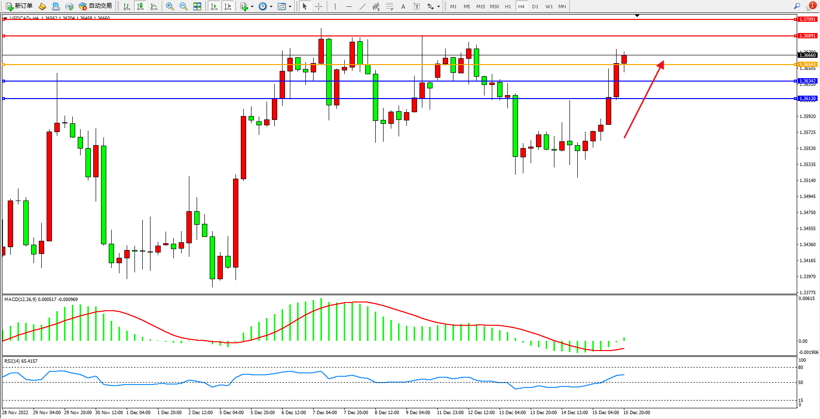 美元加元USDCAD——4小时K线图显示: