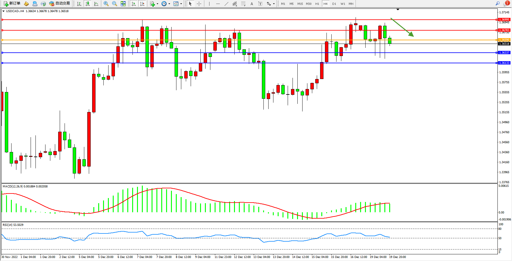美元加元USDCAD——4小时K线图显示: