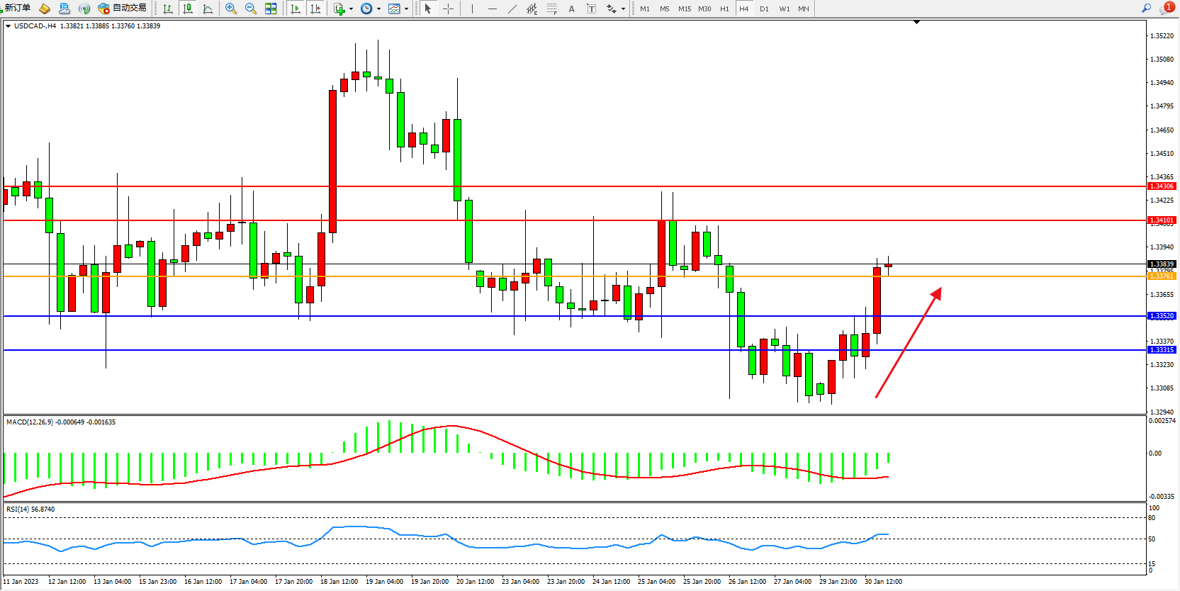 美元加元USDCAD——4小时K线图显示: