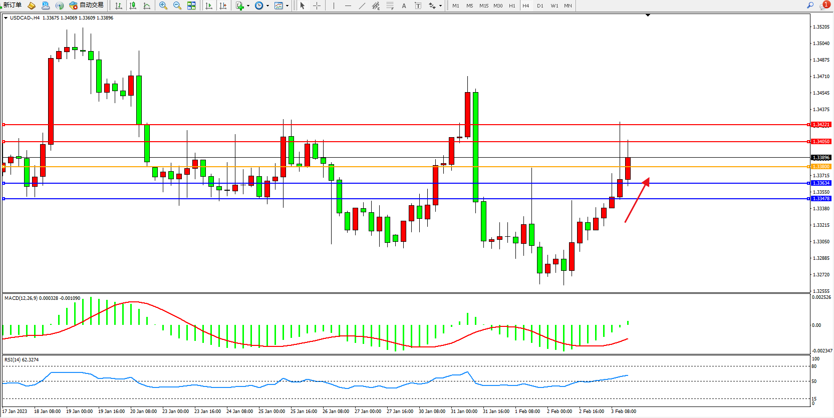 美元加元USDCAD——4小时K线图显示: