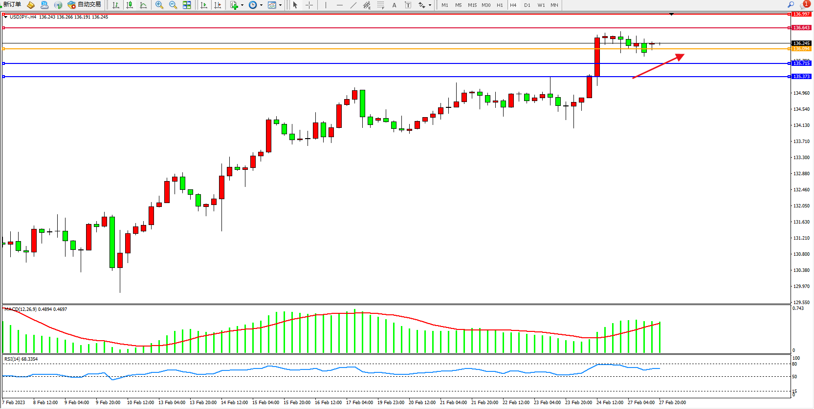 交易策略:136.094上方看涨,目标136.643、136.997