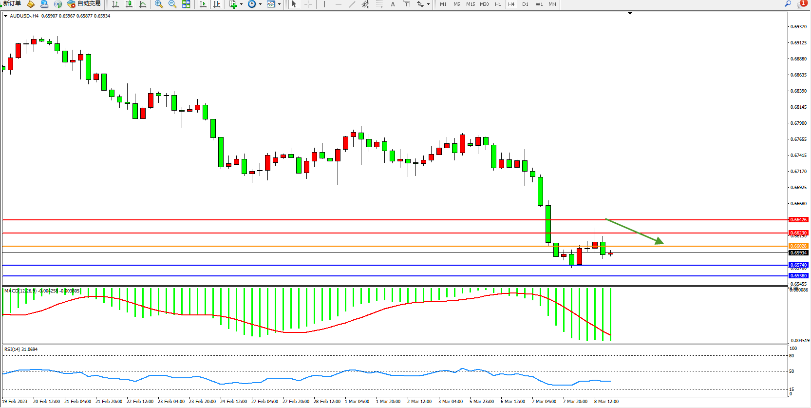 交易策略:0.66028下方看跌,目标0.65740  0.65580