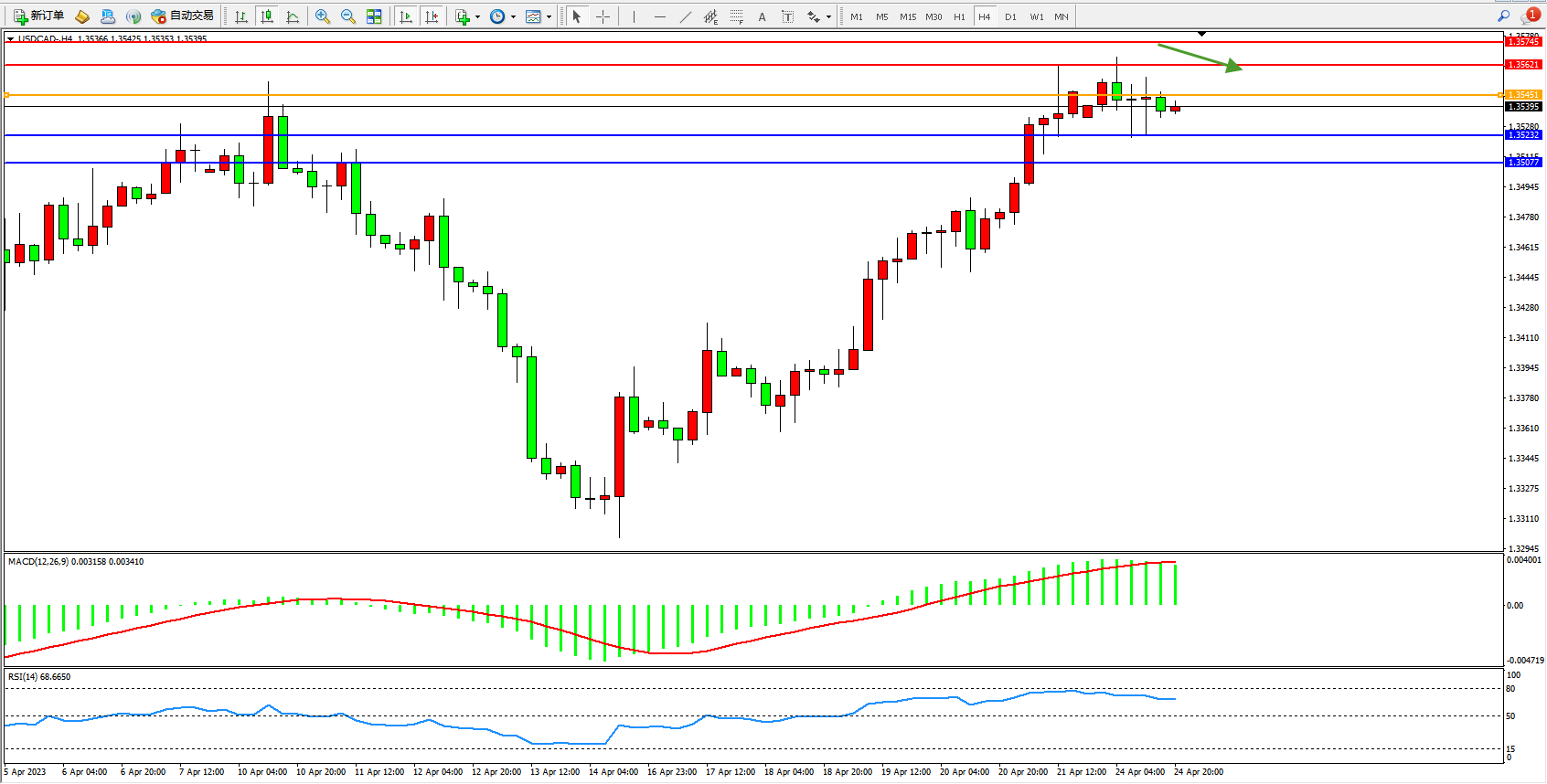 美元加元USDCAD——4小时K线图显示:
