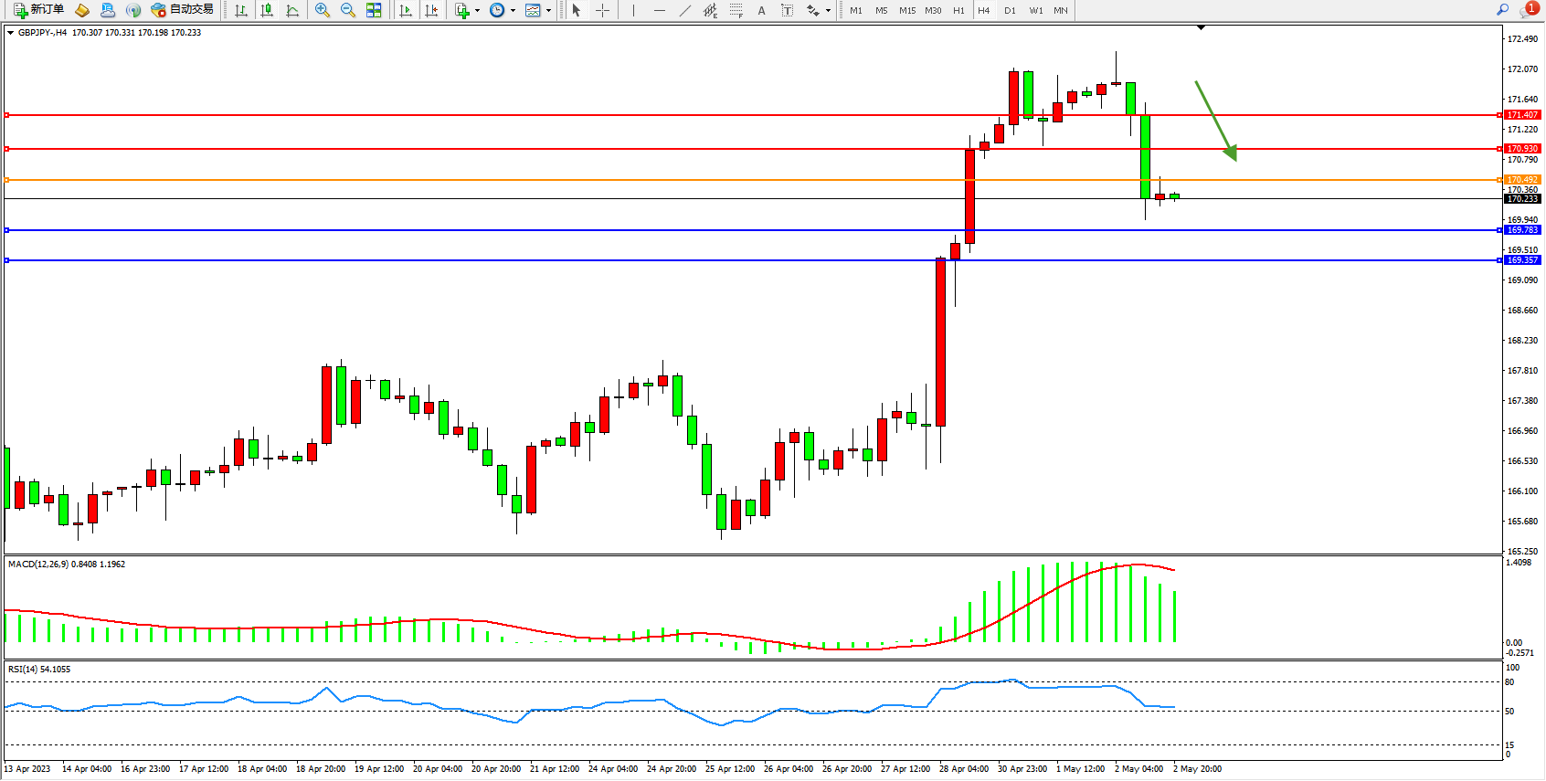 交易策略:170.492下方看跌,目标169.783  169.357