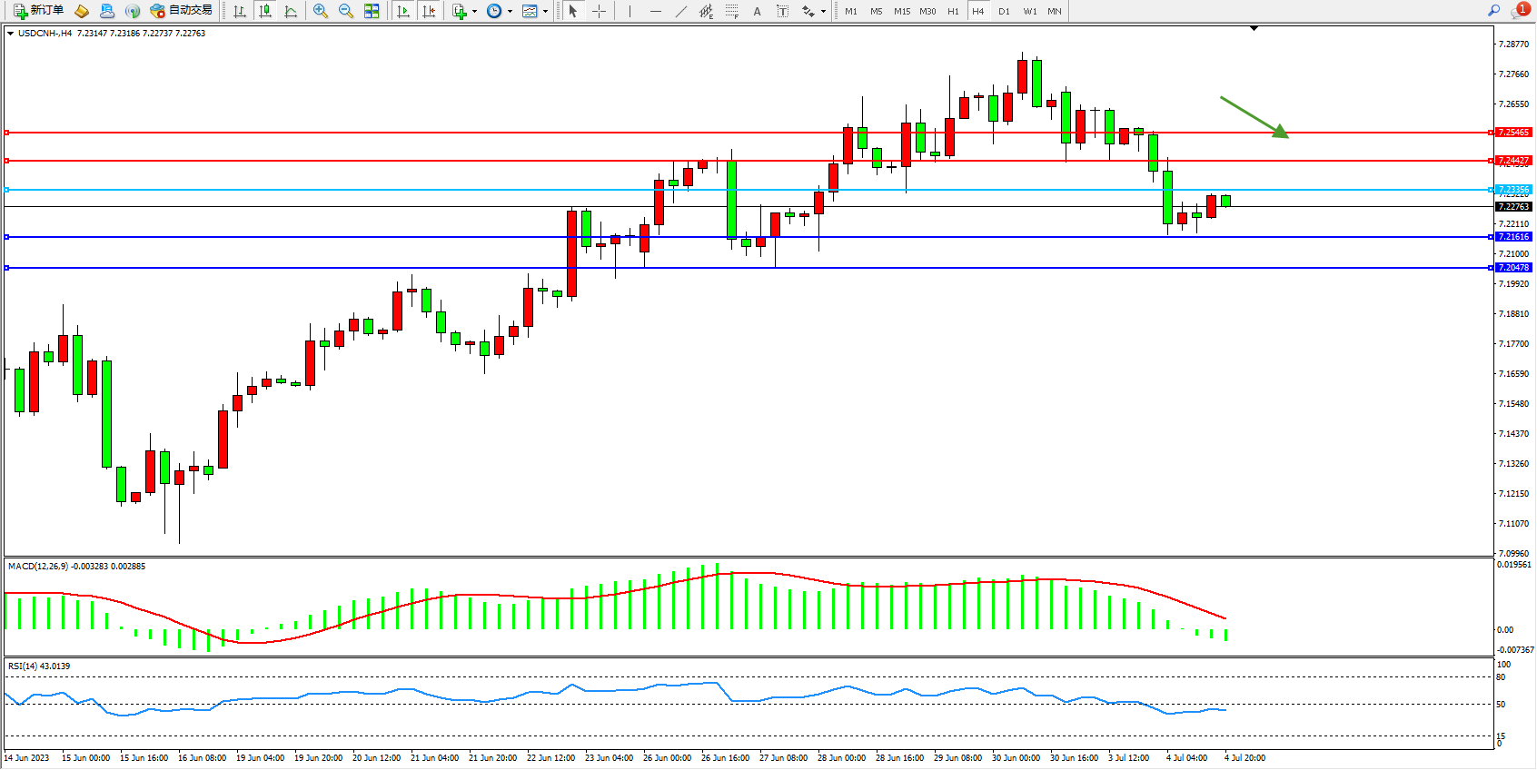 美元人民币USDCNH——4小时K线图显示: