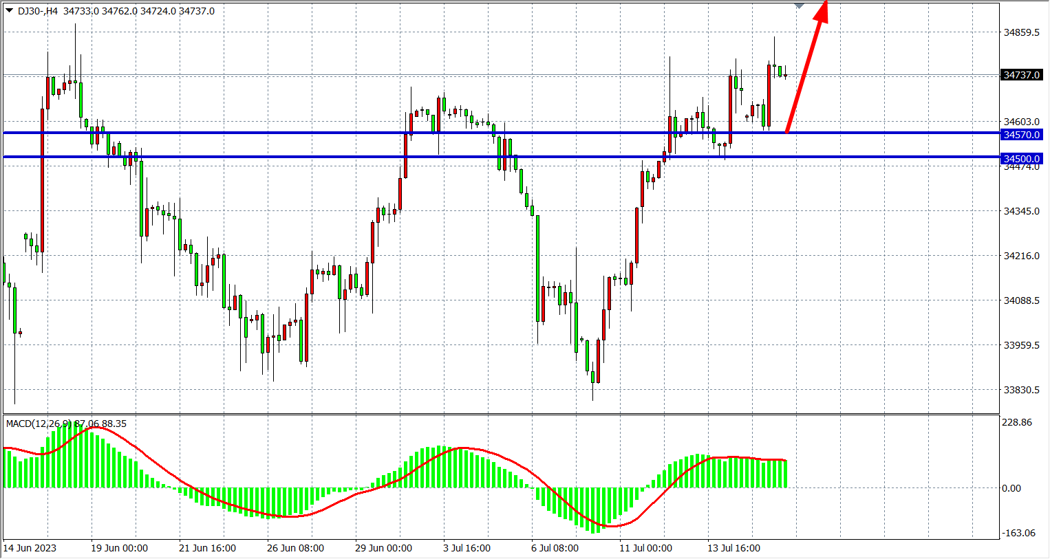 交易策略:34570 上方看涨,目标 34800 35000