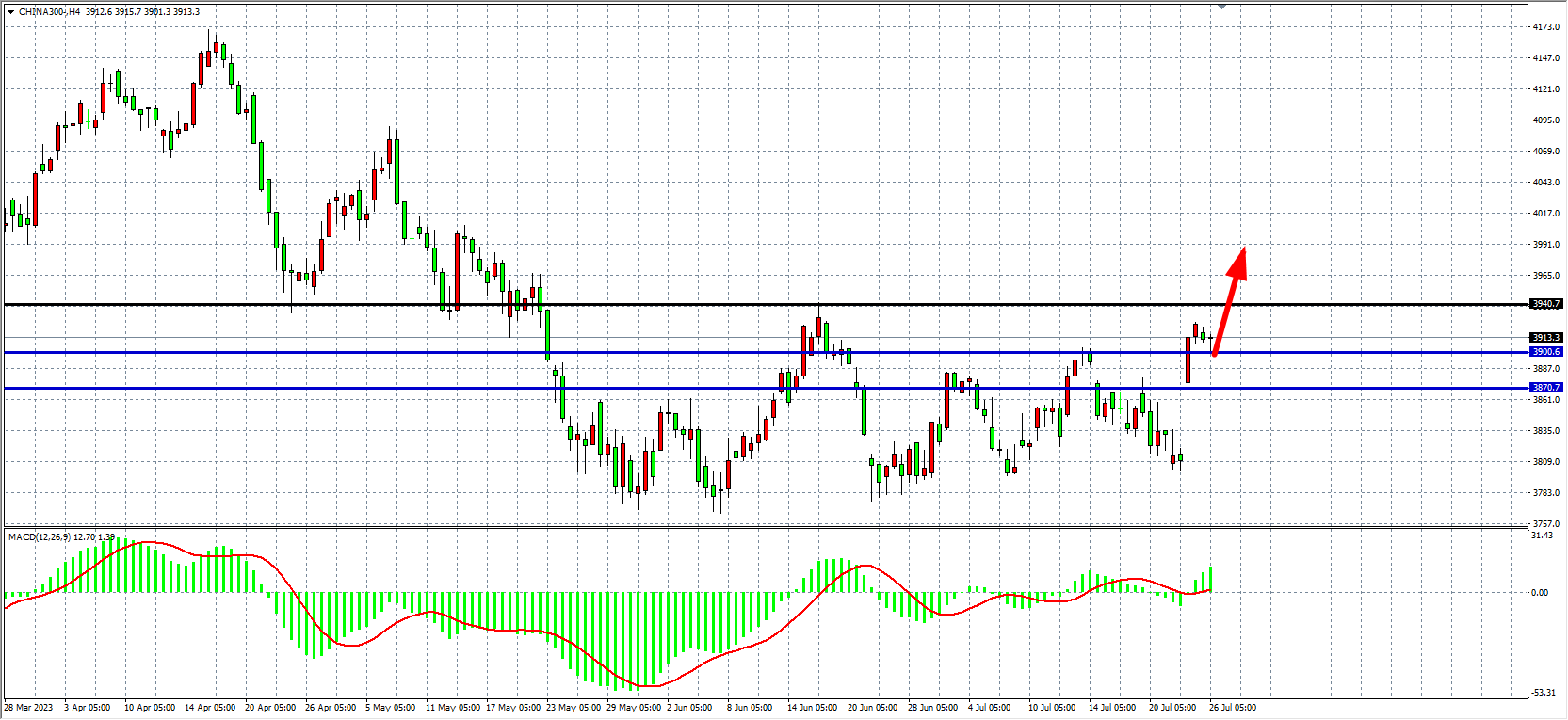4小时图看,沪深300维持在3900之上震荡,MACD在零轴上放量,行情形成破位上攻,支撑关注3870-3900附近,上方压力看3940-3980。