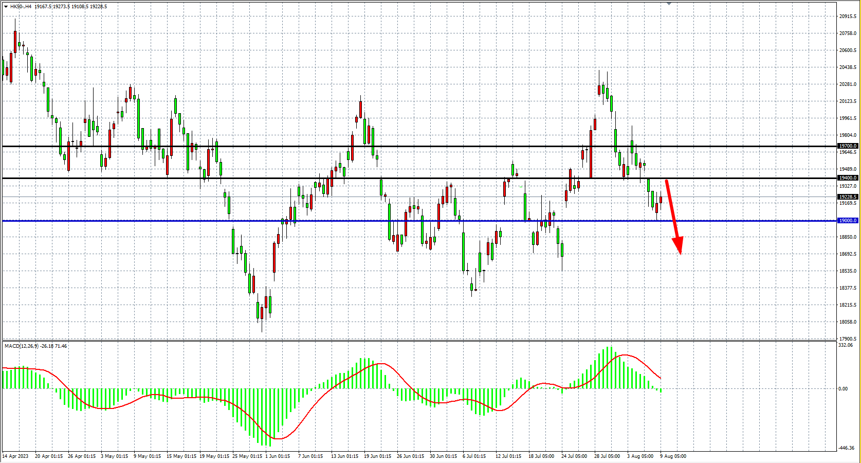 4小时图看,恒指在19000之上盘整,MACD量能下穿零轴,阻力关注19400,支撑关注19000附近。