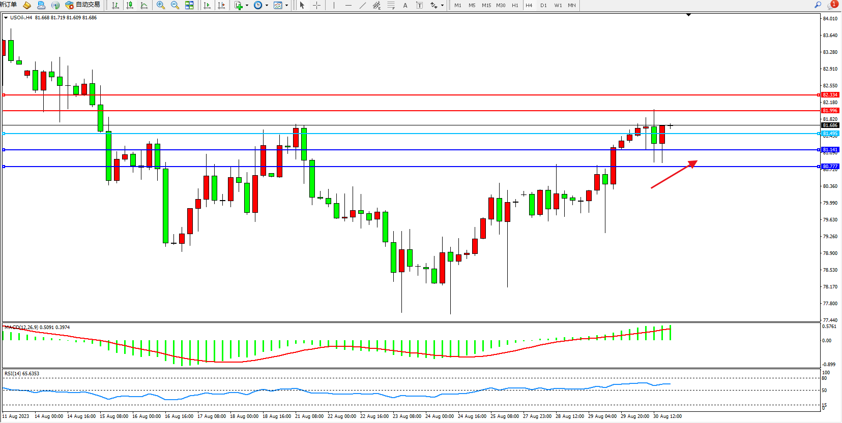 原油USOil——4小时K线图显示: