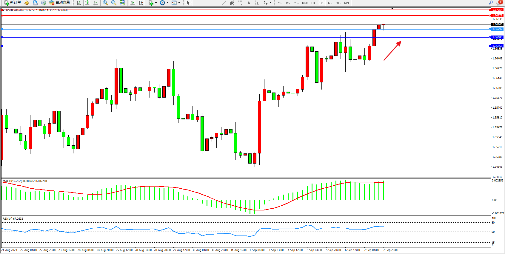 美元加元USDCAD——4小时K线图显示: