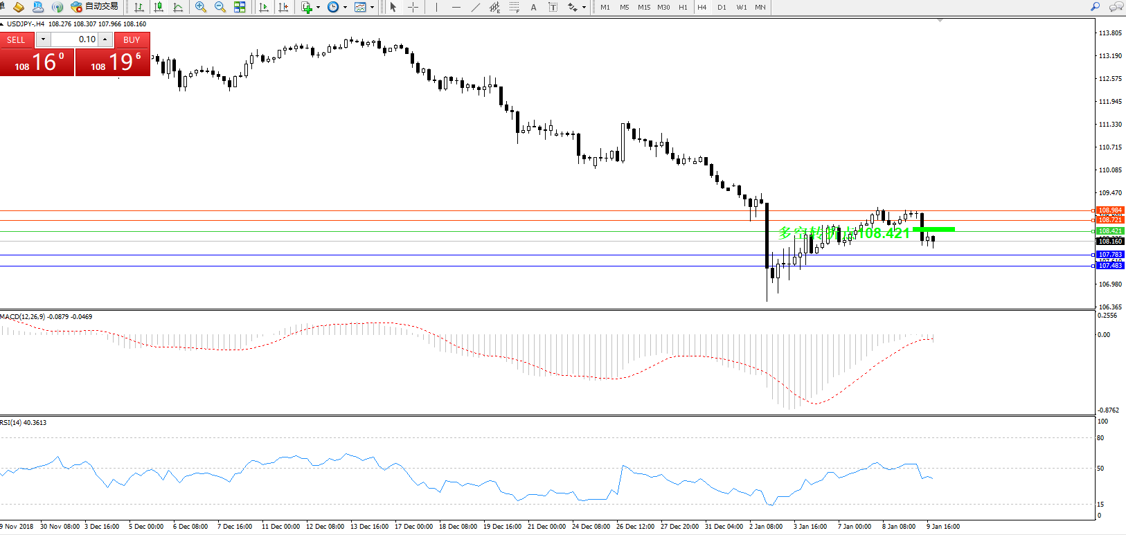 交易策略:108.421下方看跌,目标107.783107.483