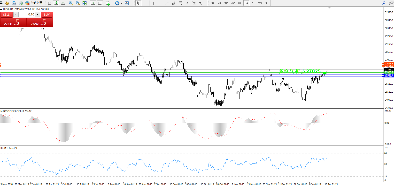 恒指HK50 ——4小时K线图显示: