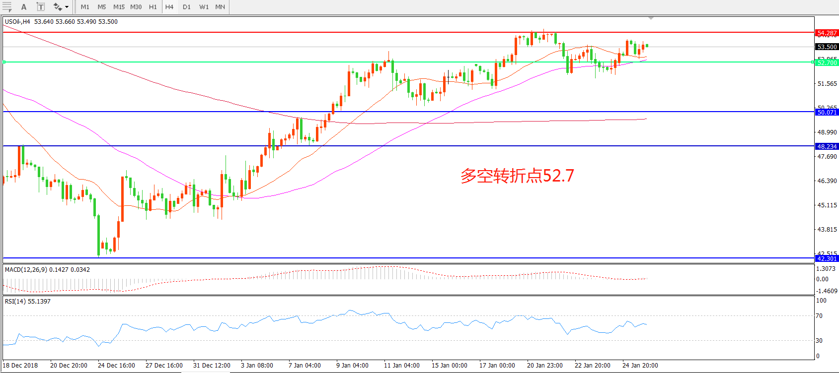 4小时图看,油价经过连续整理站稳52美元,短期整理后受制于54美元关口, 呈现区间震荡形态,均线系统逐渐走平, MACD红柱减少,回落52.7附近后做多为合理选择。