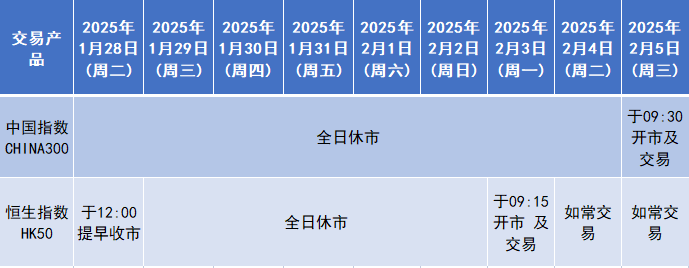因应2025年1月28日至2月4日期间为国内及香港农历新年假期,本公司以下产品的交易时间将于假期期间作以下安排,敬请留意。