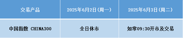 因应2025年6月2日(周一)为端午节假期,本公司以下产品的交易时间将于假期期间作以下安排,敬请留意。