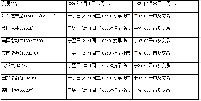 因应美国马丁路德金纪念日假期2026119(周一) 本公司以下产品的交易时间将于假期期间作以下安排,敬请留意。