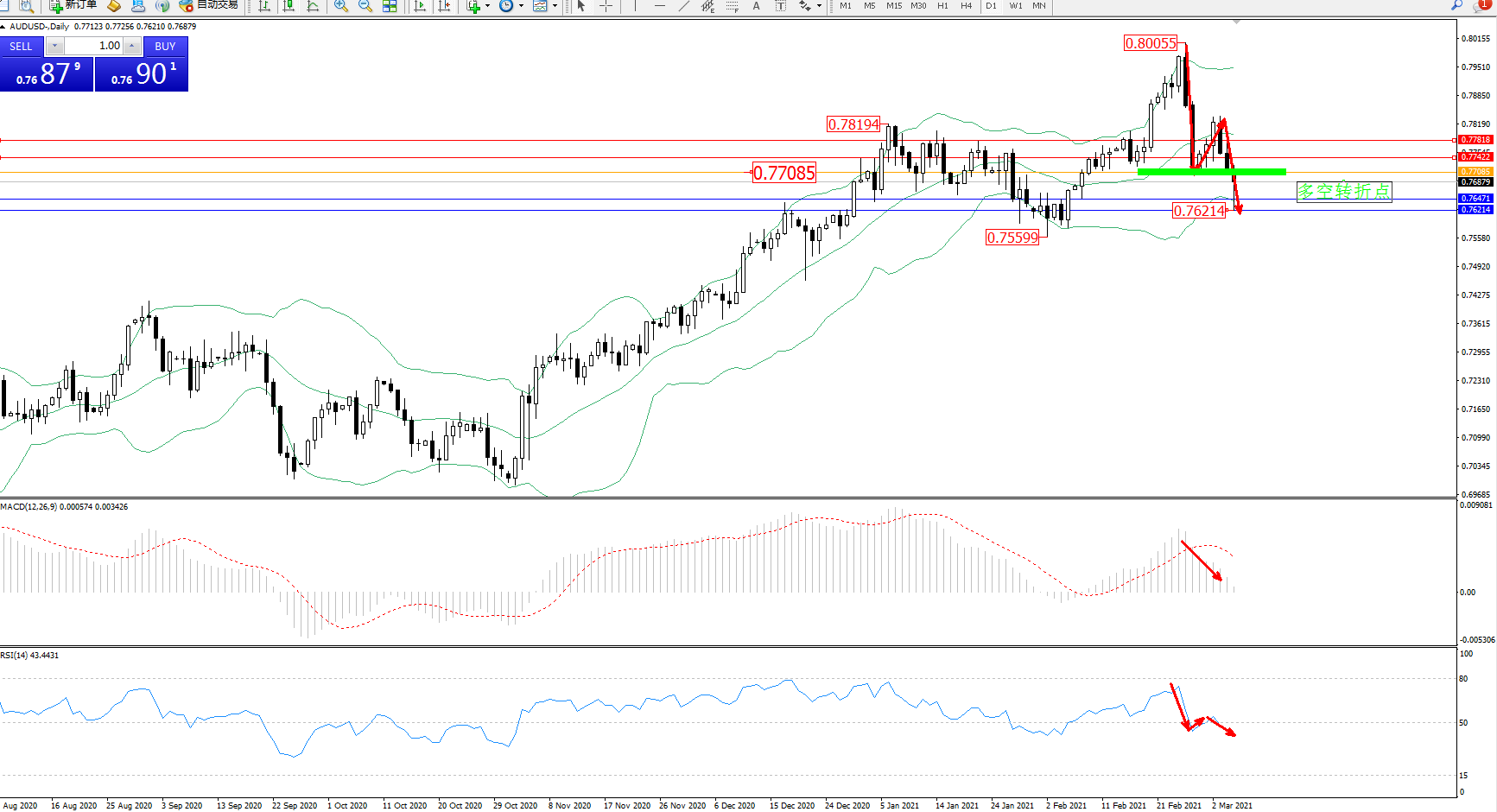 备选策略:0.77085上方看涨,目标0.77422、0.77818