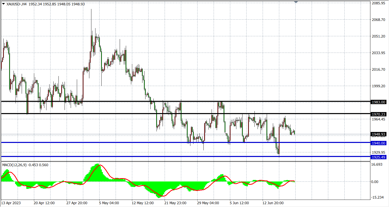 周一(6月19日)受美元走强和美联储鹰派言论影响,黄金在1950美元附近徘徊